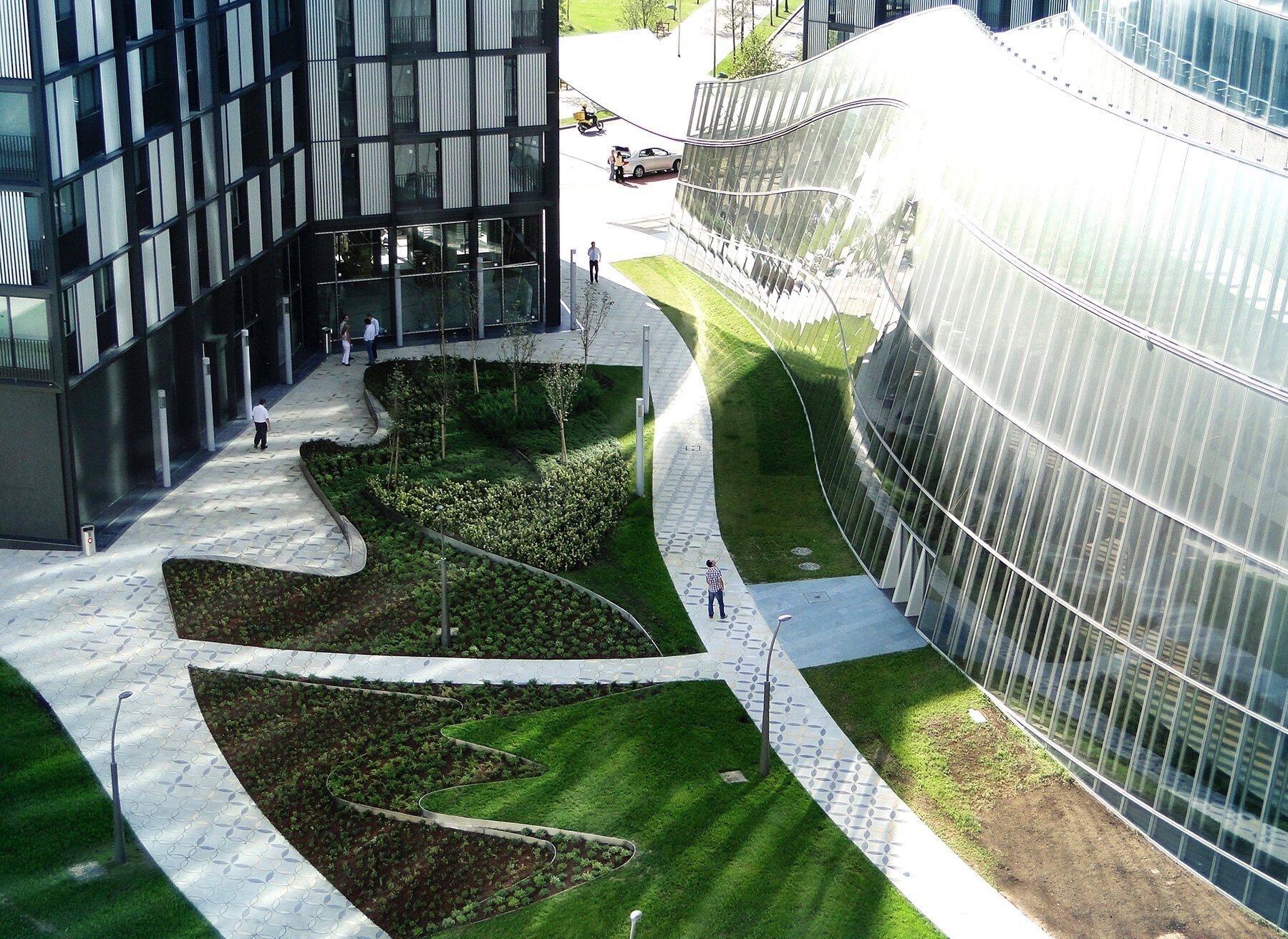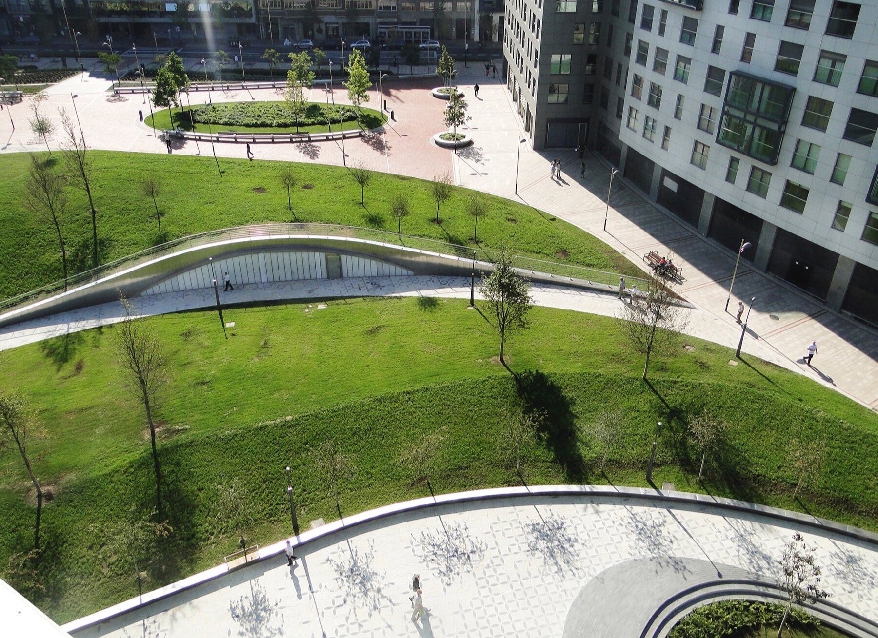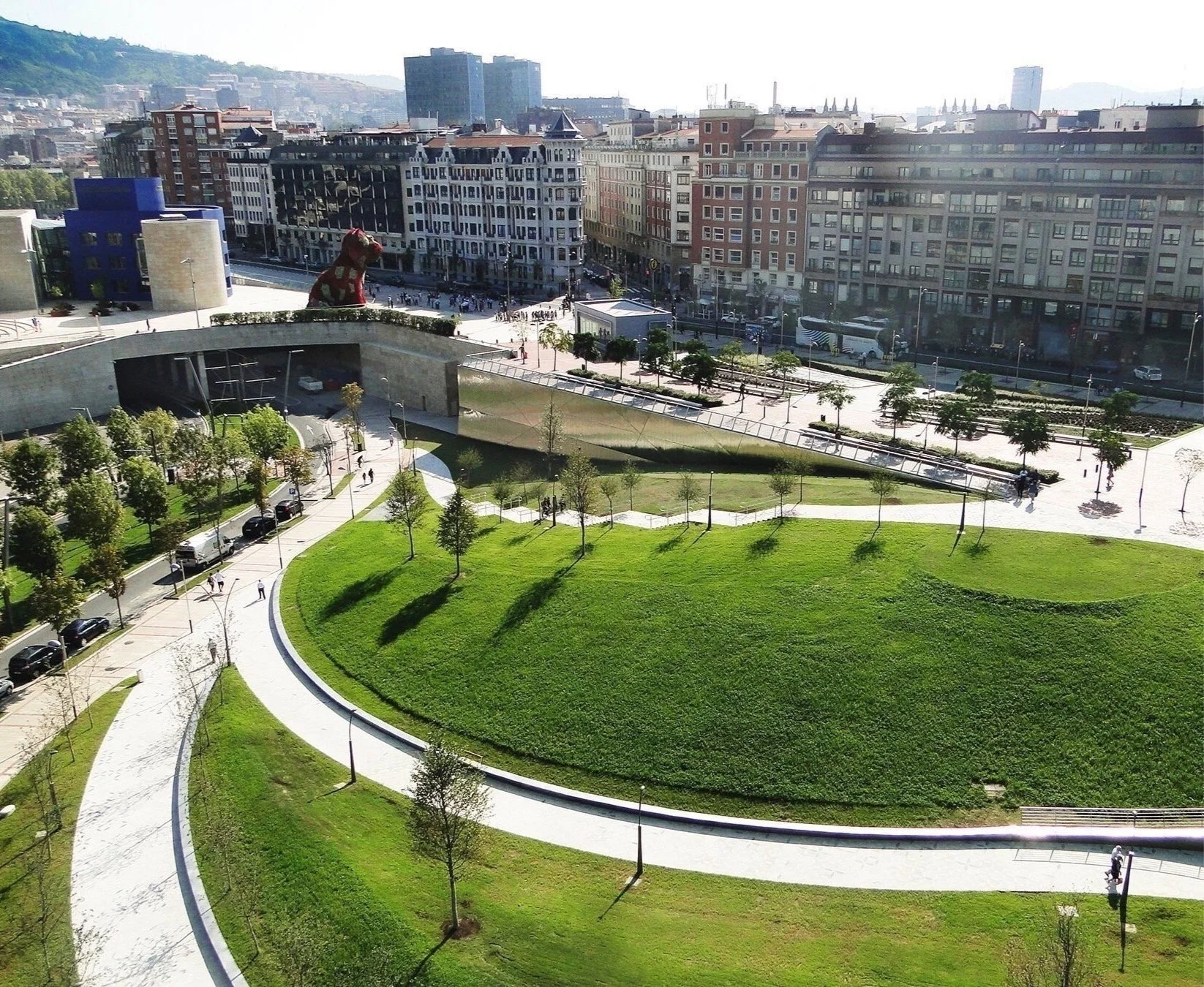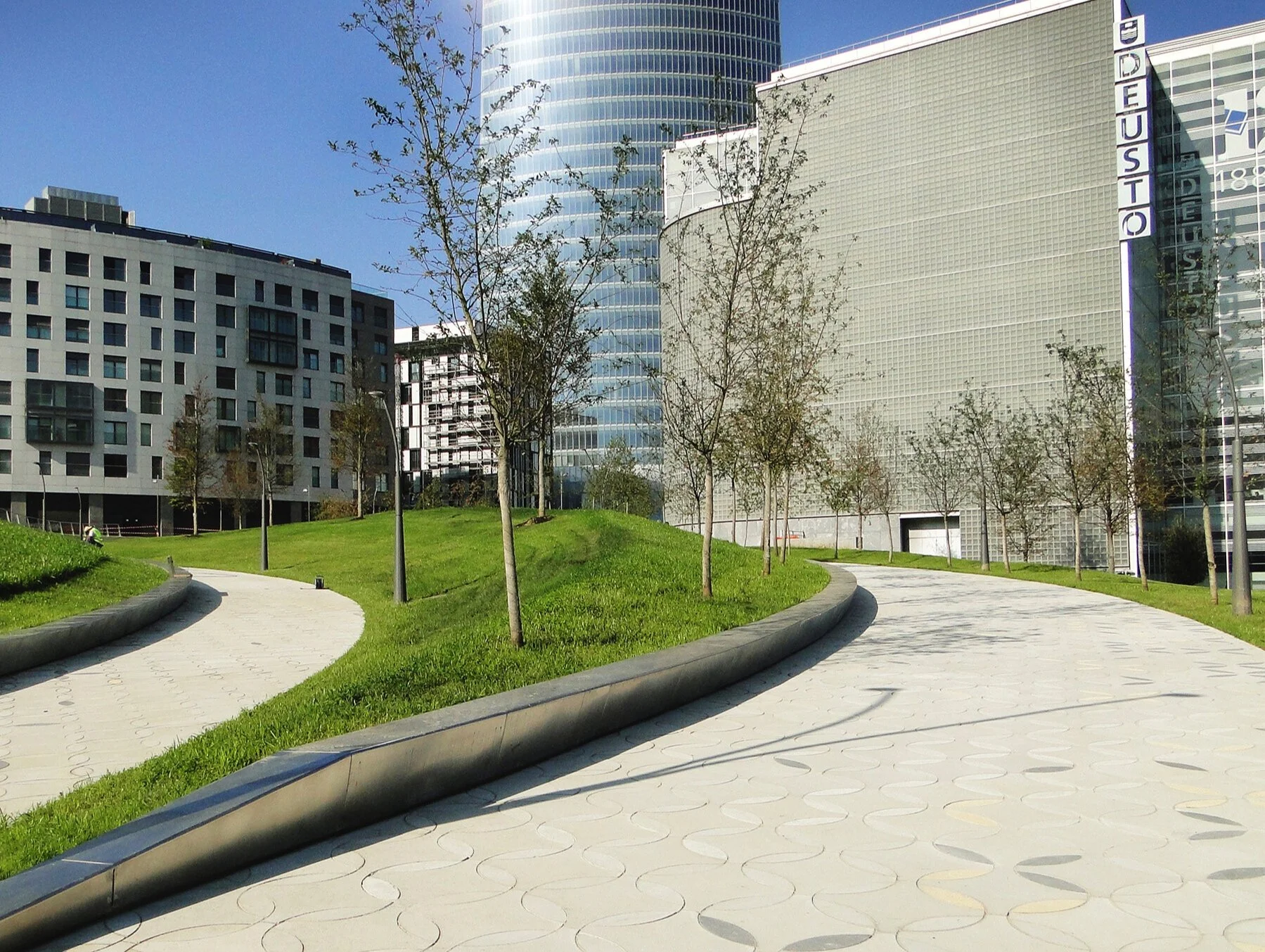 Este parque es el último sector del Masterplan de Abandoibarra, cuya función es vincular los espacios públicos que lo rodean y envolver a los edificios universitarios y residenciales. Mediante un conjunto de terrazas se abre un sistema de conexiones que llevan a los peatones hacia la ría de Bilbao, cada una tratada distintivamente para generar nuevas experiencias. En los bordes, linderos con la calle Mazarredo y el Puente de Deusto, se crearon revestimientos de acero inoxidable para ocultar muros y definir los límites, dialogando con el resto de elementos. Dentro de la topografía aterrazada, un pabellón de servicios se integra junto al jardín de musgos, los jardines de Iberdrola y los muros perimetrales, conformando ámbitos de diverso carácter que enriquecen este proyecto de conexión y vinculación con el entorno.