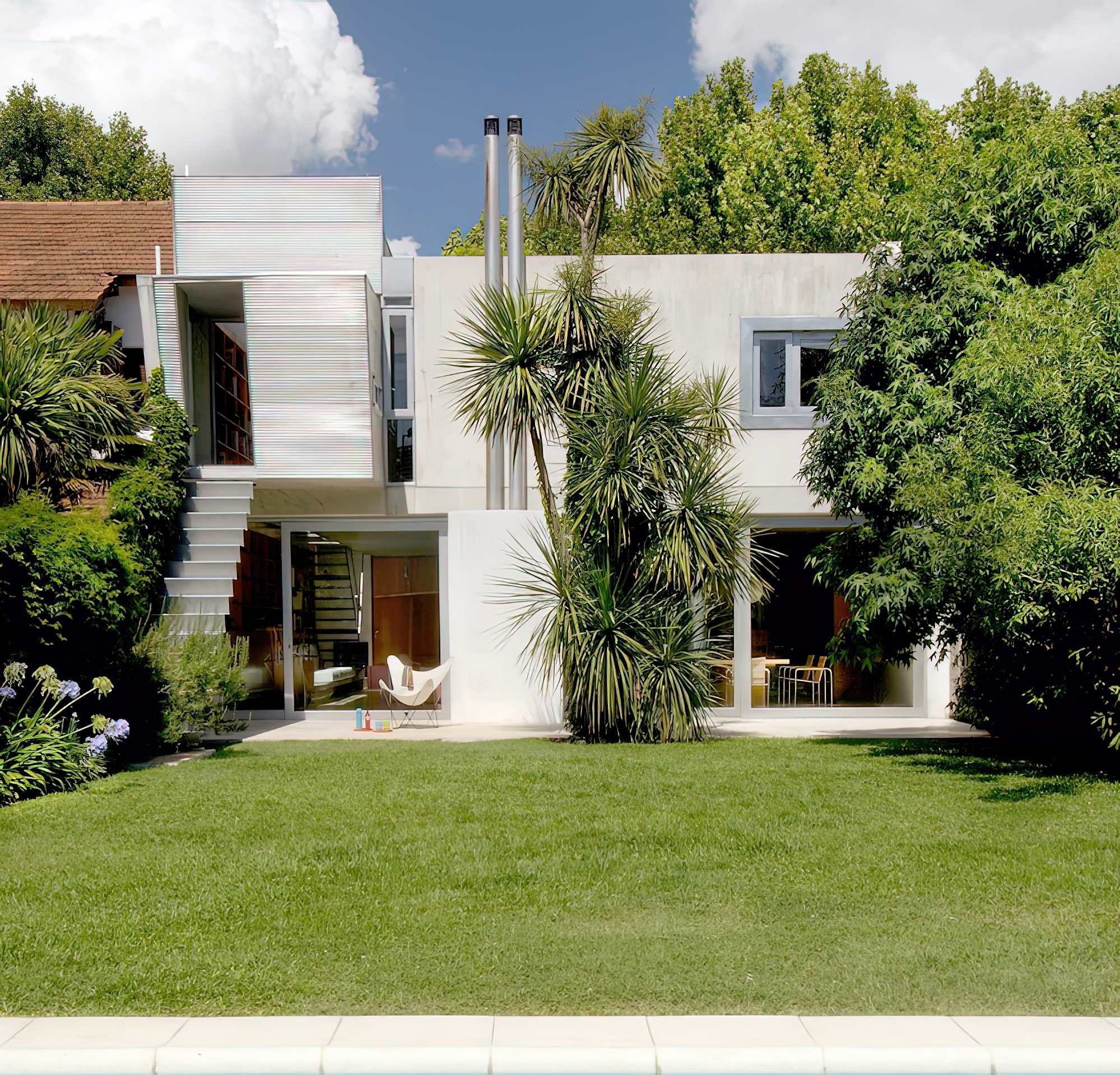 Esta casa entre medianeras se organiza en torno a un patio interno permeable, articulando los espacios de los dos niveles. Las medianeras sirven de soporte para dos grandes volúmenes de madera, donde uno de ellos, la biblioteca, se separa de las losas de hormigón, creando un vacío de doble altura que alberga la circulación y deja pasar la luz a la planta baja. A la verticalidad de este espacio central y del patio, se contrapone un volumen horizontal metálico en la planta alta, que acoge los servicios. La casa se configura así en torno a un patio unificador, que enfatiza la relación entre los niveles a través de elementos arquitectónicos contrastantes.